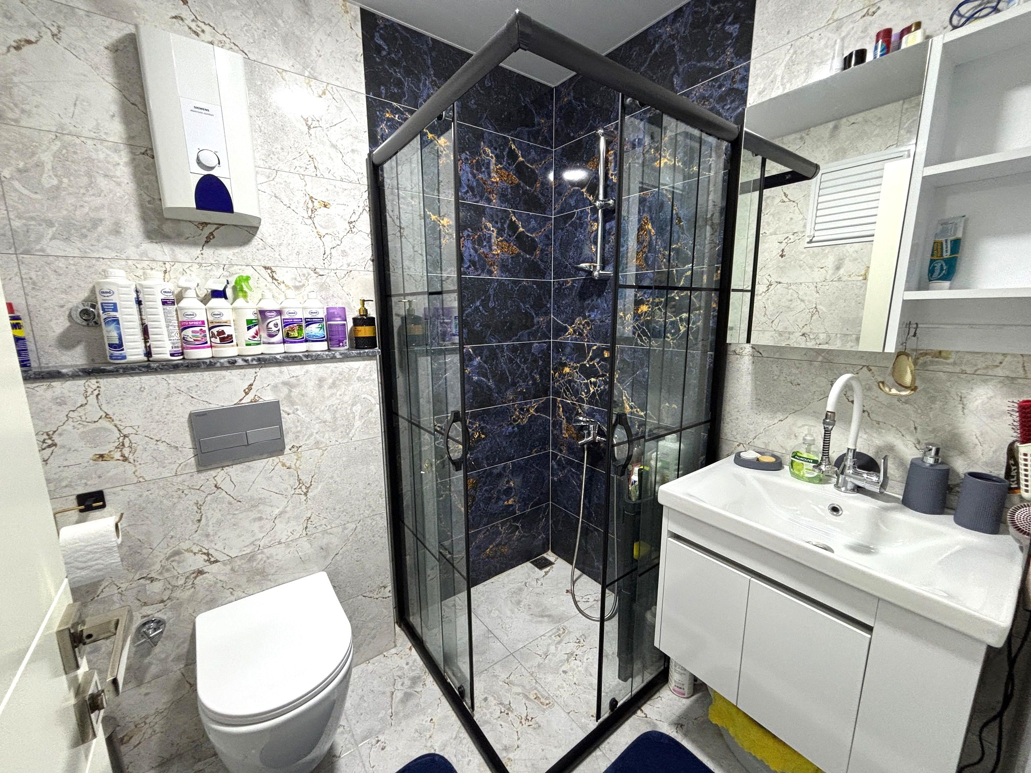 • equipped bathroom (shower cabin, set of sanitary equipment, built-in furniture, wall mirror, water heater)