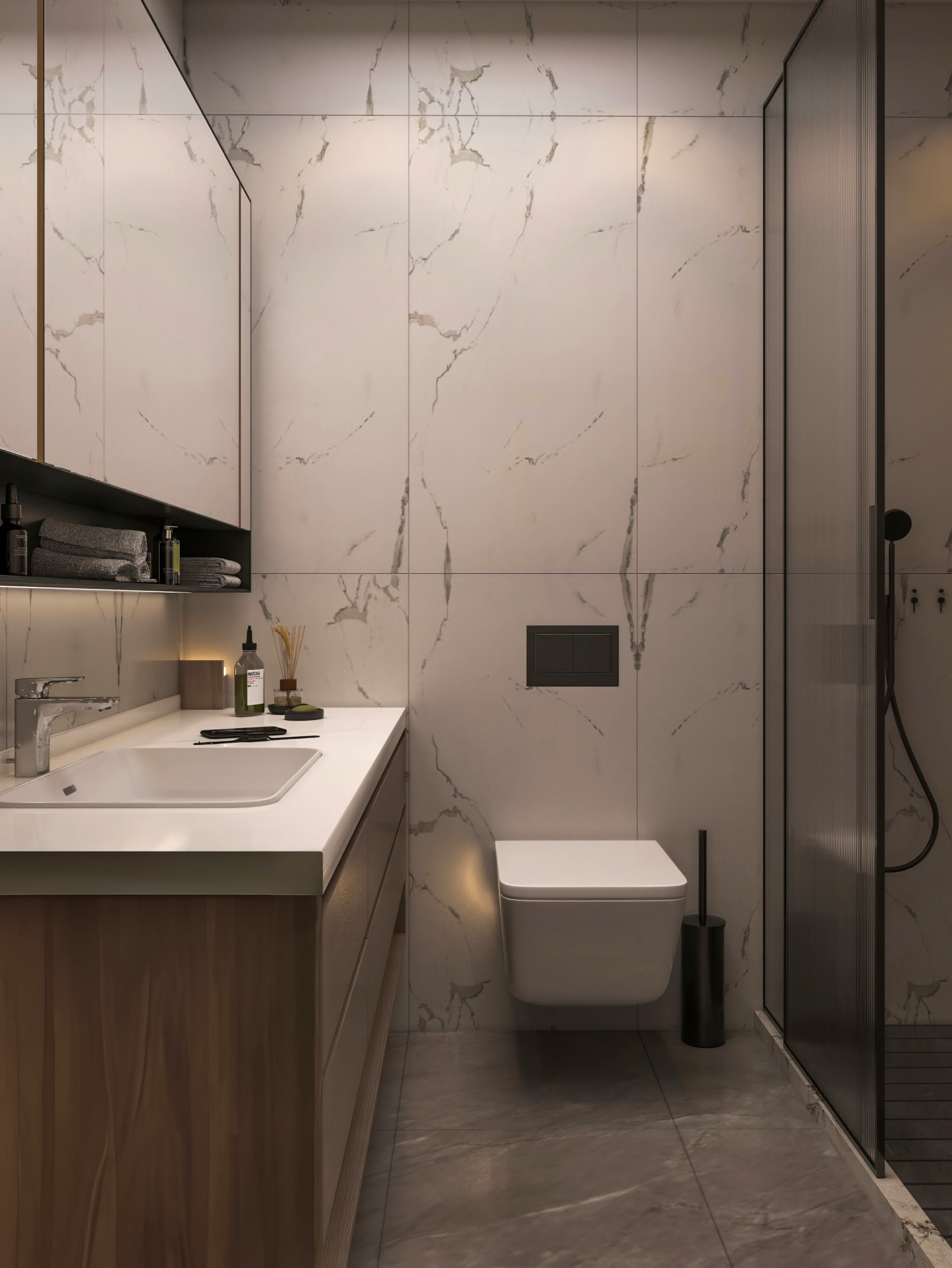 • equipped bathroom (shower cabin, bathroom set, built-in furniture, wall mirror)