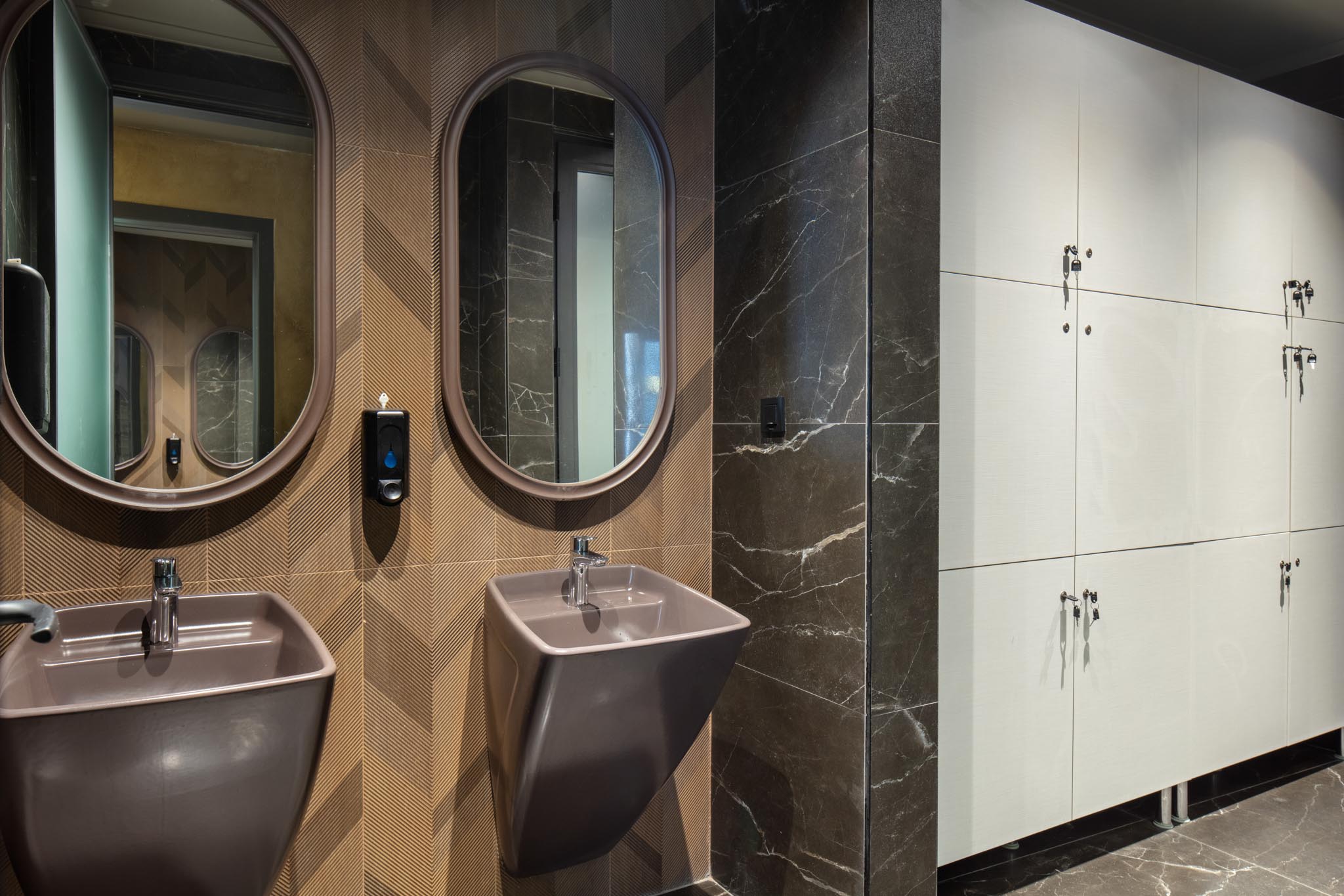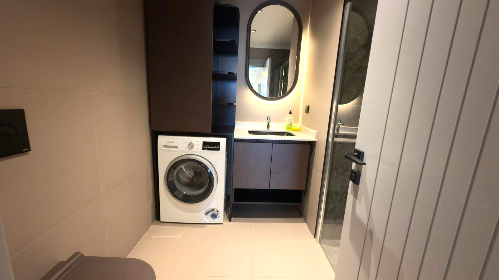 equipped bathroom (shower cabin, BOSCI Italian plumbing kit, GROHE faucets, built–in furniture, wall mirror, water heater)