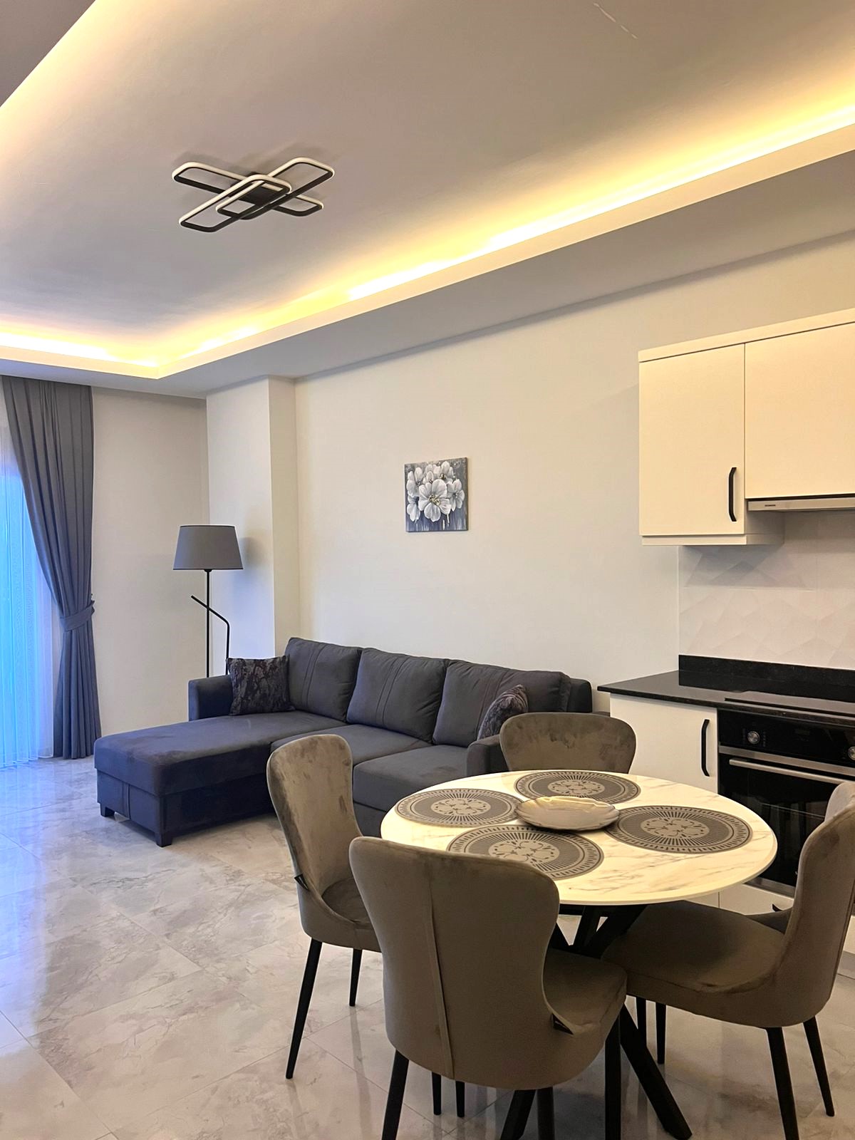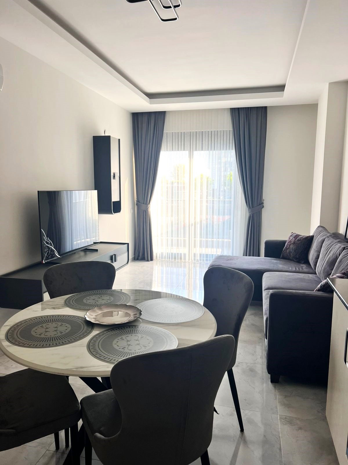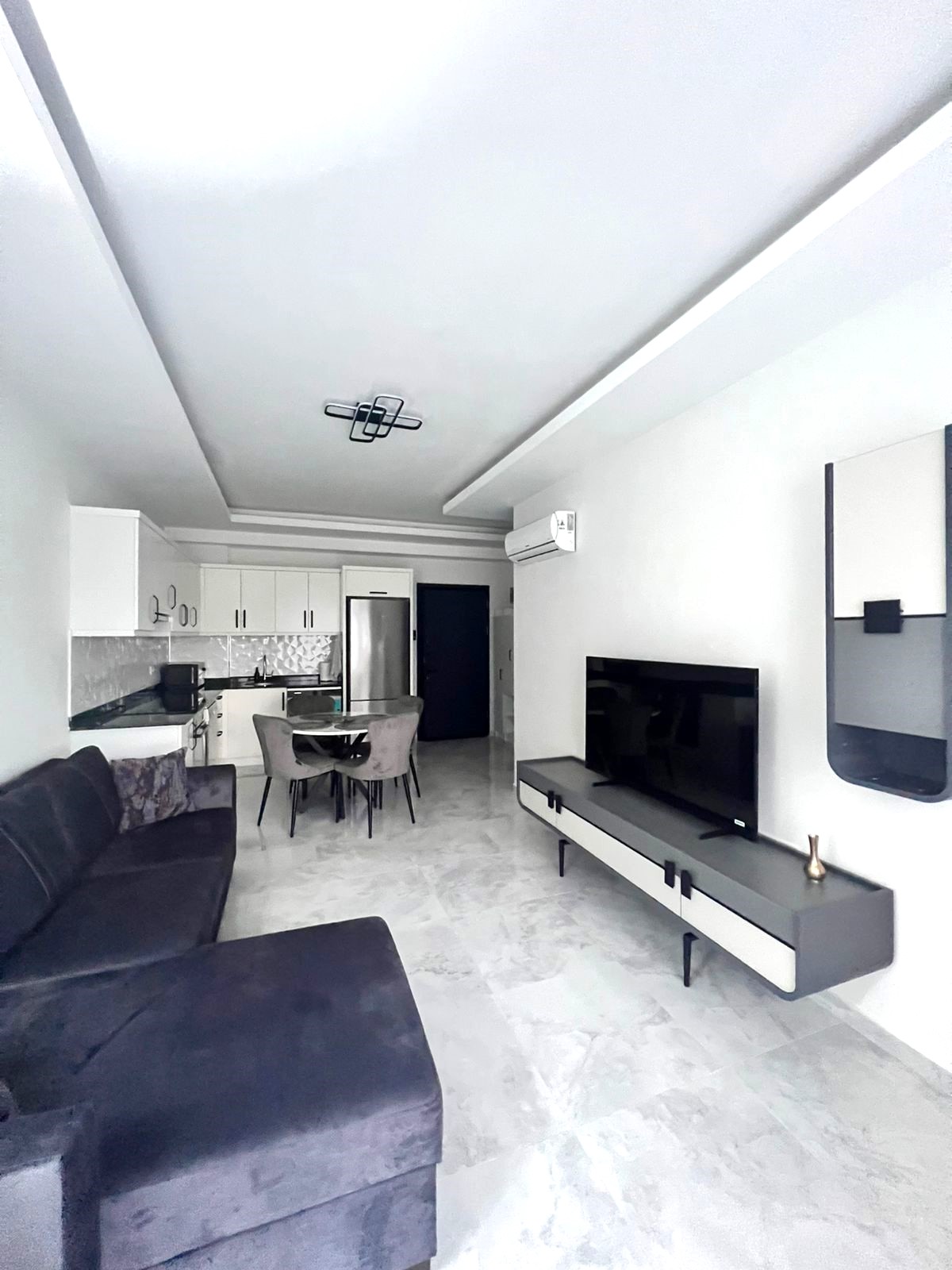 • 1+1 apartment – 53.5 m2, block B, 0 floor (2.5 level), south side, 1 living room with American kitchen, 1 bedroom, 1 bathroom, 1 balcony, with furniture and Siemens appliances, aydat – 2.000 tl.