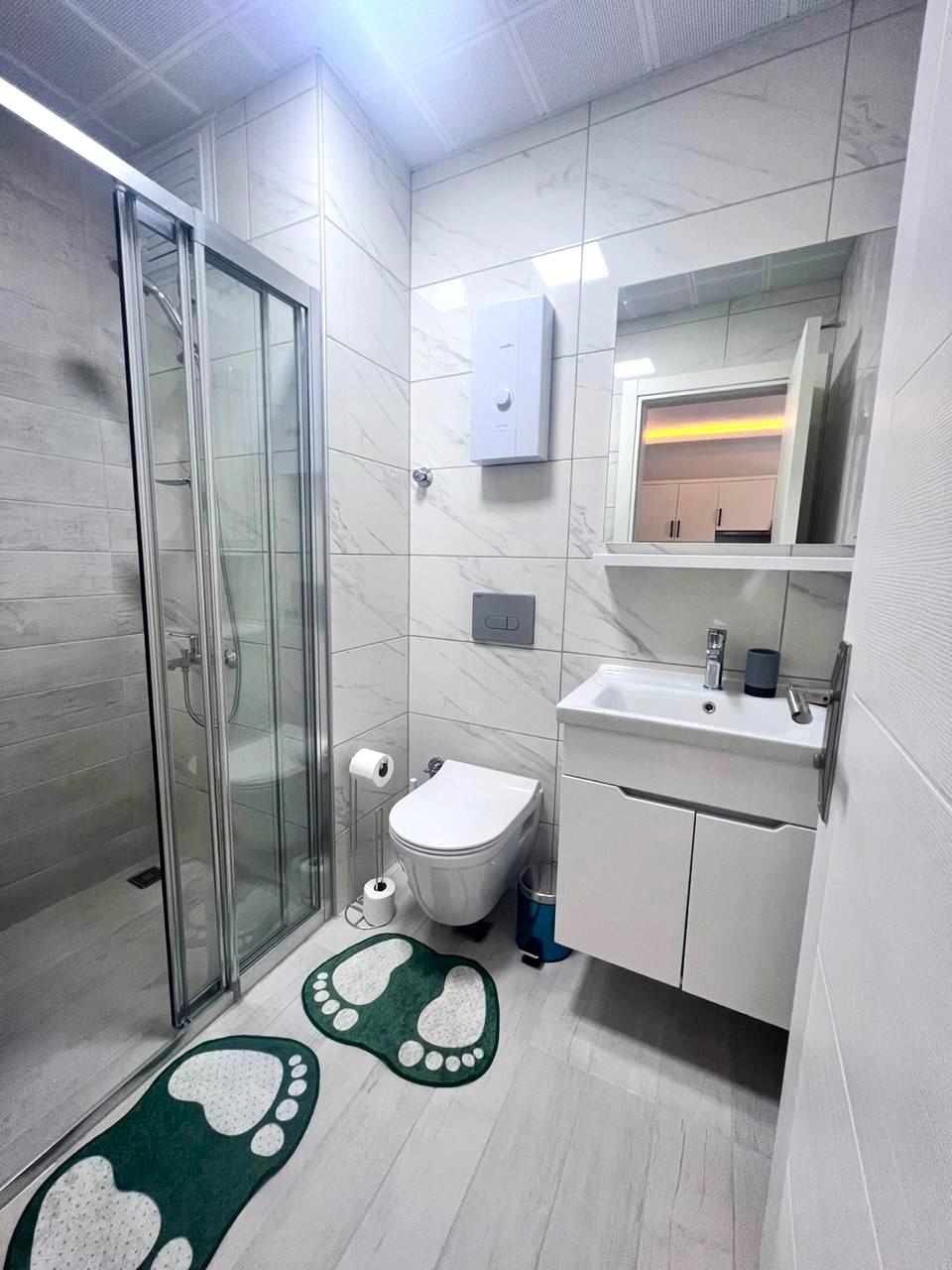 • equipped bathroom (set of plumbing fixtures, shower cabin, built-in furniture, wall mirror, water heater)