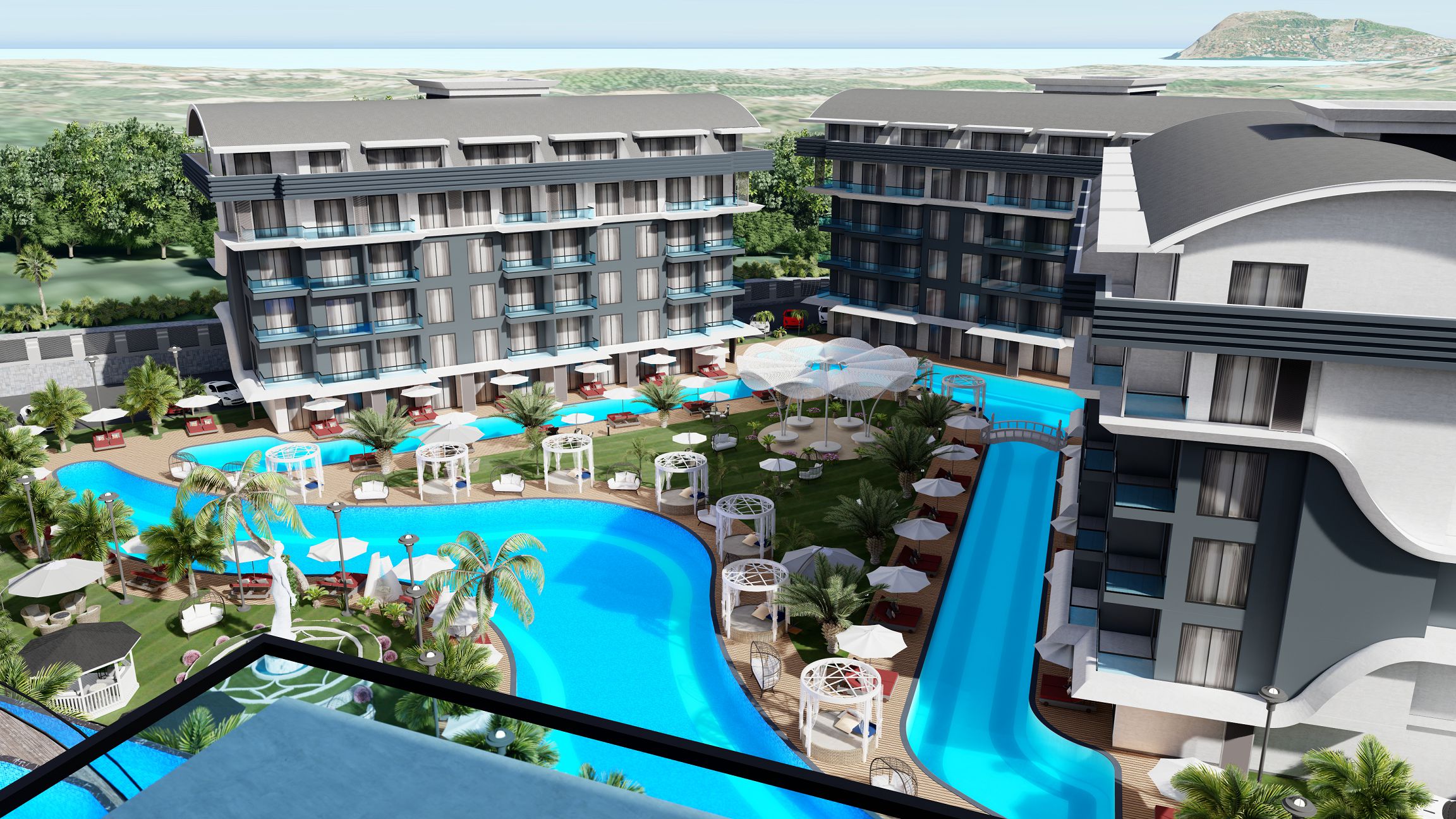 The complex with a total area of 17,800 m2 consists of seven 5-storey blocks in a fenced area, it is distinguished by a special architectural concept and planning of recreation areas in the yard, the maximum territory is reserved for swimming pools. There is a modern design, quiet area, proximity to Bahçeşehir college, Amerikan kültür college and Waldorf, Fenerbahçe football school and equestrian club, chain stores, new shopping centers, cafes and restaurants, city hospital, public transport stop, recreation areas on the Obacay river. The area has been rapidly developing in recent years, it is a new Alanya, blocks of modern buildings with excellent views and everything necessary for everyday life. Own infrastructure of the complex will provide an opportunity to live or spend holidays in safety, comfort and away from the noisy center of the resort. It is an interesting investment option.