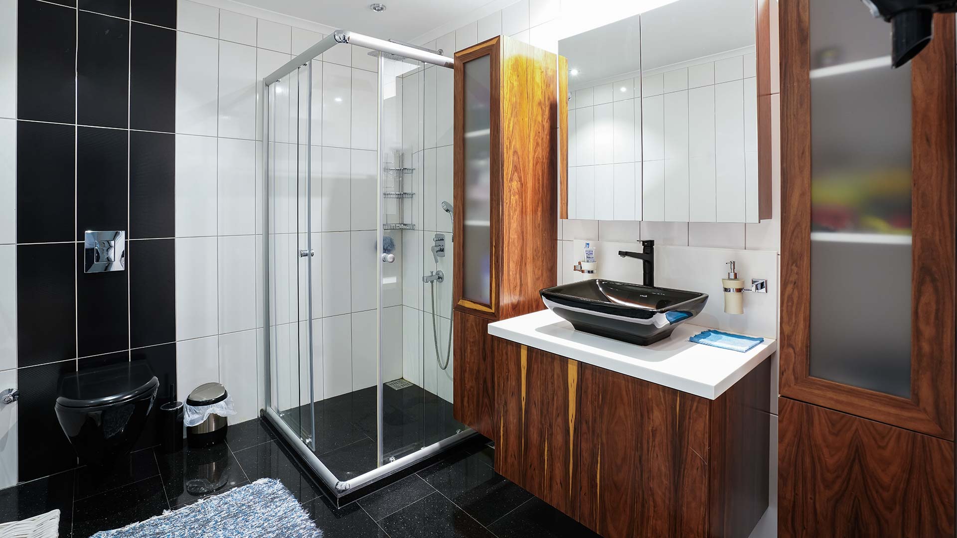 • оборудованный санузел (душевая кабина, комплект сантехники, встроенная мебель, настенное зеркало, водонагреватель)