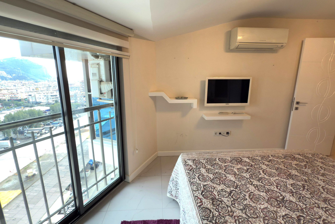 Двухуровневые меблированные апартаменты с двумя спальнями, видом на море, горы, город и историческую крепость в комплексе с премиум-класса всего в 800 метрах от пляжа Клеопатра в центральном районе Аланьи – Кадипаша (Kadipaşa).