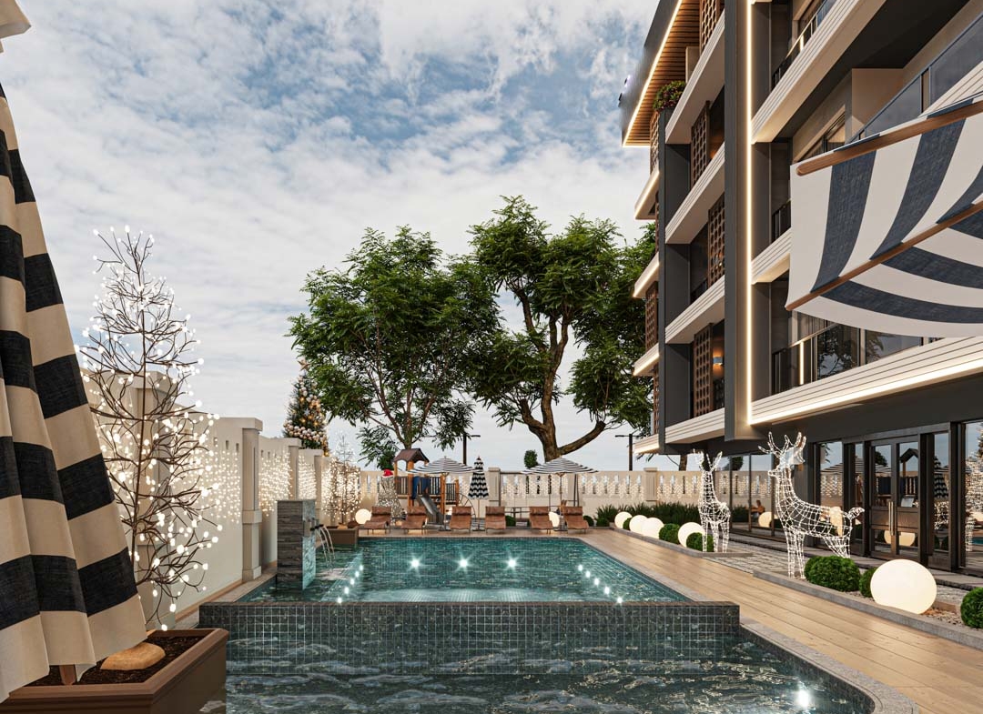 Комплекс общей площадью 1 431 м2 состоит из одного 4-этажного блока на огороженной территории. Современный дизайн, вся необходимая для жизни и отдыха инфраструктура, удобное расположение и транспортная доступность социальных объектов центральной части курорта подходят для проведения отпуска или постоянного проживания в стороне от городской суеты, но в непосредственной близости от административного центра. Хороший вариант для инвестиционных вложений на стадии старта строительства.