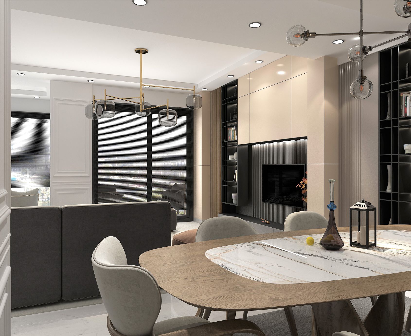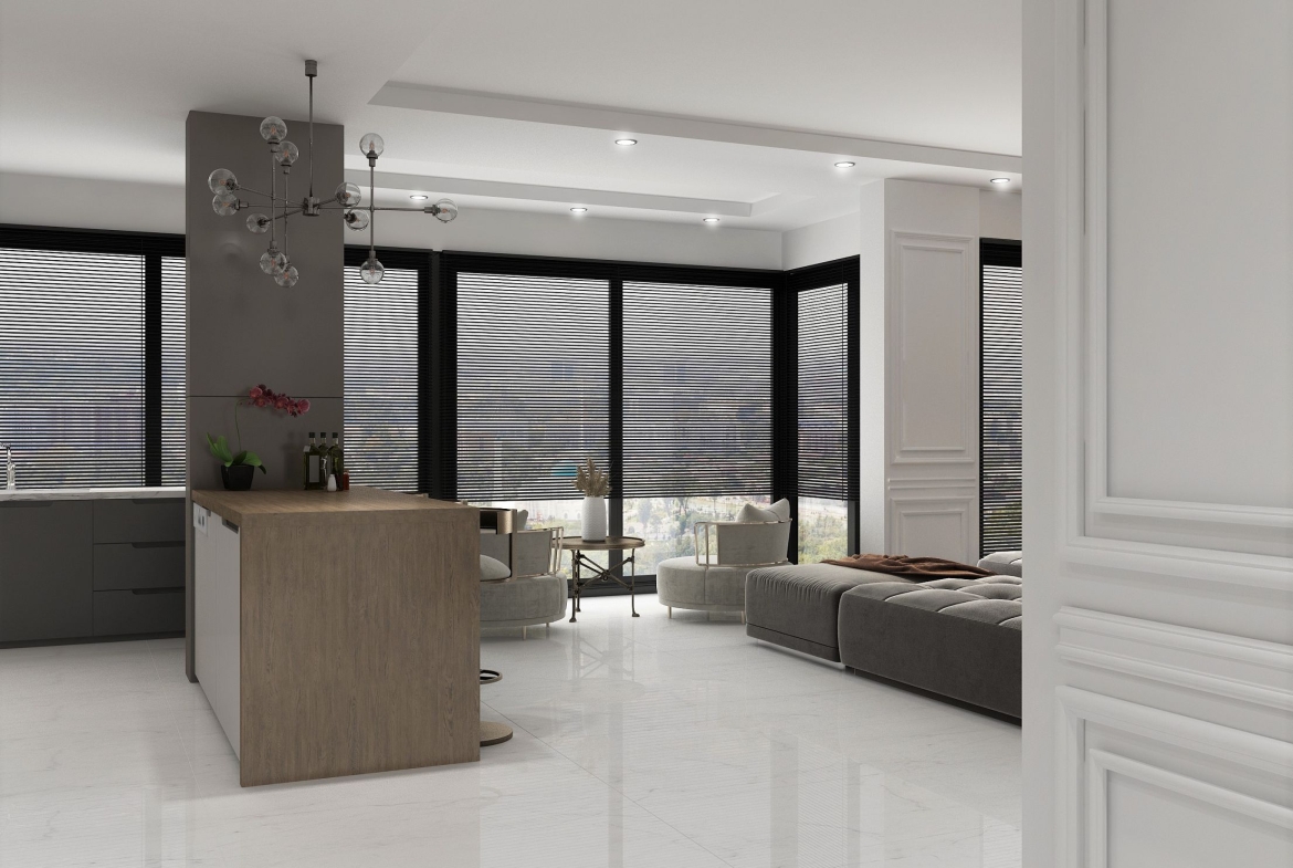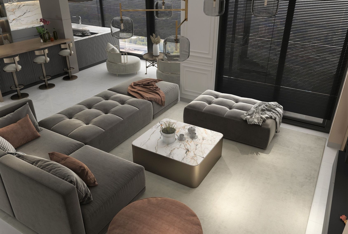 - встроенный кухонный гарнитур с кварцевой рабочей поверхностью