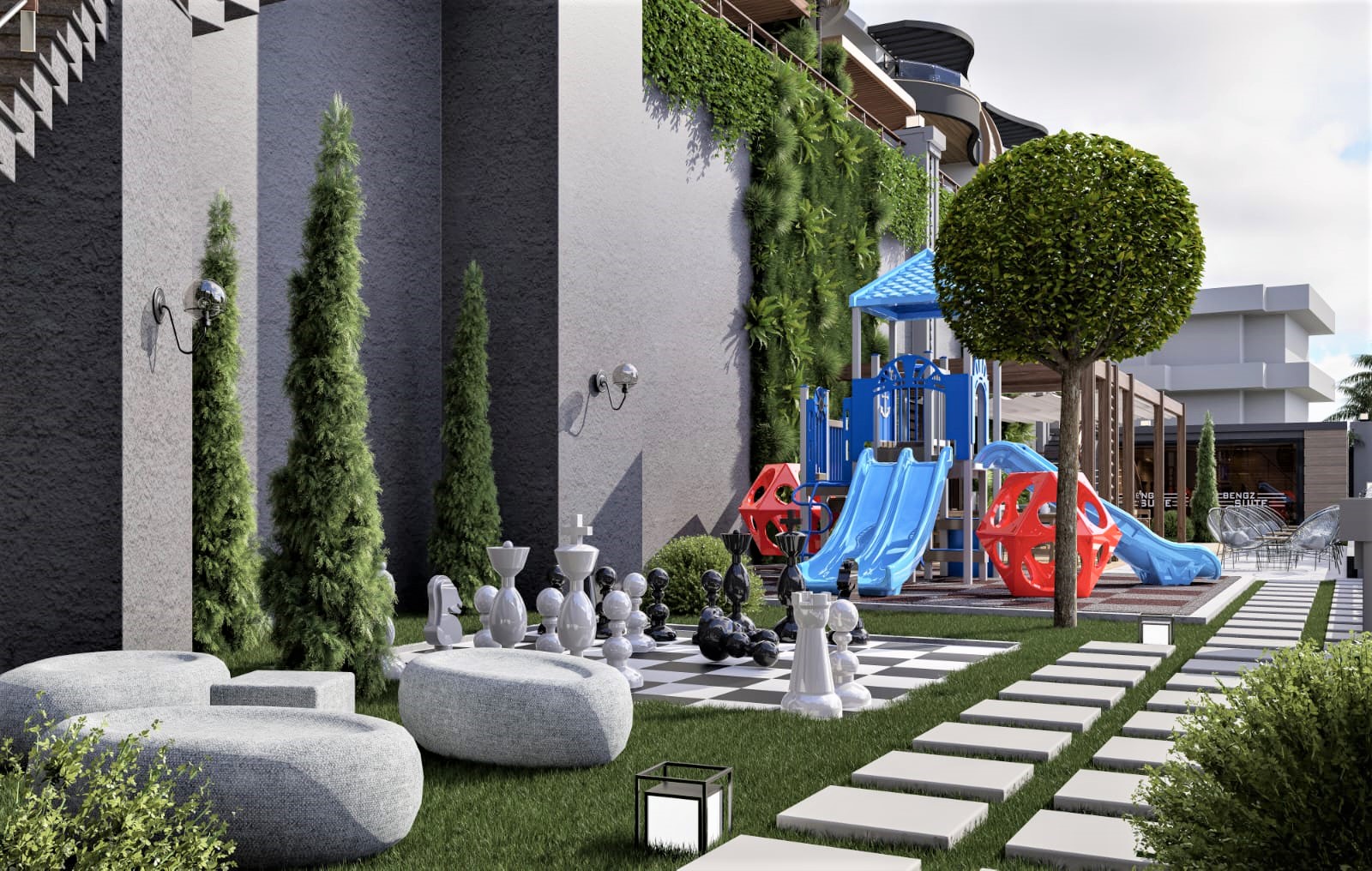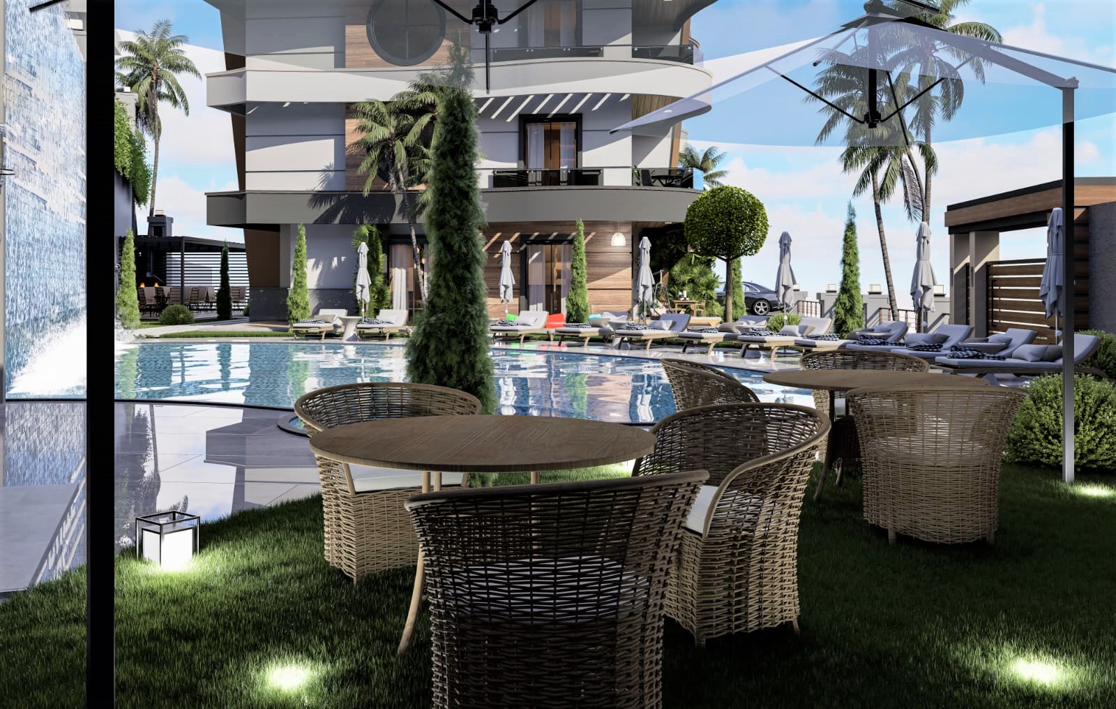 Комплекс общей площадью 5 444 м2 состоит из четырёх 4-этажных блоков на огороженной территории и находится среди частных вилл и соснового леса недалеко от небольшого горного водопада. Приватное расположение и спокойная атмосфера в стороне от шума курорта, прекрасные виды на античную крепость, зелень Торосских гор и побережья, вся необходимая для жизни и отдыха инфраструктура. Замечательное сочетание транспортной доступности к социальным объектам города – в пешей доступности находятся магазины, кафе и рестораны, школы и лицеи, а также парк отдыха. Исторический центр находится всего в 2 километрах с его торговыми центрами, восточными и рыбным базарами, спортивными центрами и городскими парками, что удобно для постоянного проживания семьи или проведения отпуска.