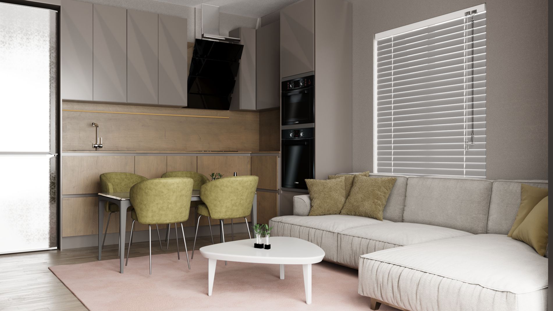 - встроенный лакированный кухонный гарнитур с гранитной рабочей поверхностью