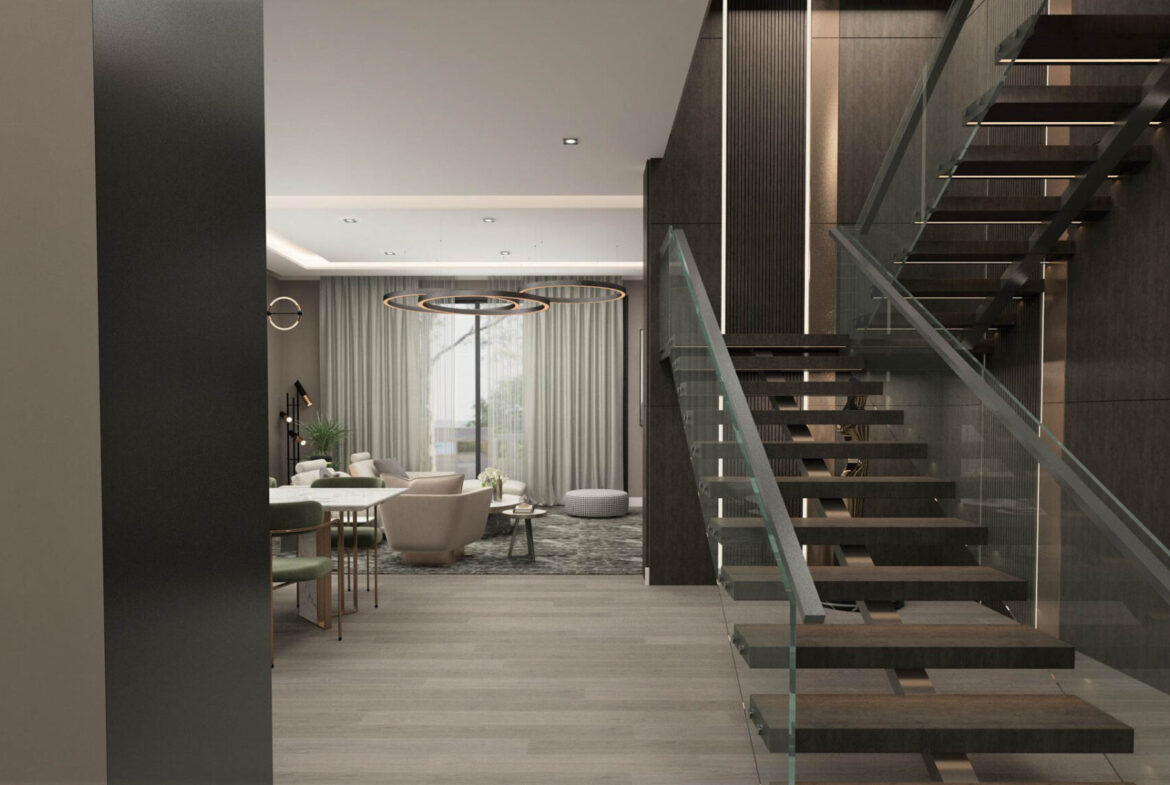 • 5+1 вилла – 3 этажа, юго-западно-северо-восточная сторона, 1 гостиная с кухней американского типа, холл, 4 спальни, 1 гардеробная, коридор, хозяйственная комната, 5 санузлов, 1 балкон (33 м2), терраса (23 м2).